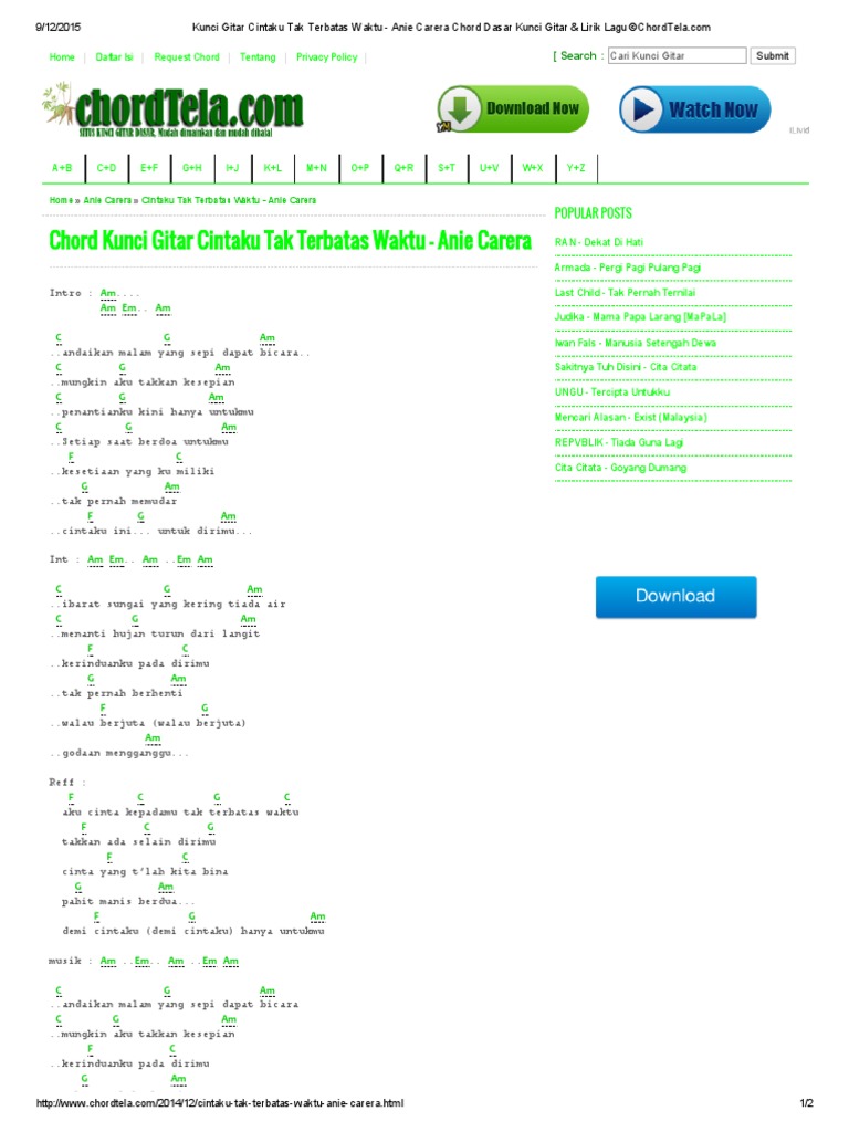 Kunci Gitar Cintaku Tak Terbatas Waktu Anie Carera Chord Dasar Kunci Gitar Lirik Lagu C Chordtela D49o90m0j049 from idoc.pub G am memanggil seluruh ragaku. Waktu yang masih tersisa g d semuanya menggeleng, semuanya terdiam a d semuanya menjawab, tak mengerti. G am memanggil seluruh ragaku. intro c am f g c aku yang tak pernah bisa am lupakan dirinya f g yang kini hadir diantara kita c namunku juga takkan bisa am menepis bayangmu f g yang s'lama ini temani hidupku chorus c am maafkan aku menduakan cintamu f g berat rasa hatiku tinggalkan dirinya c dan demi waktu am yang. D a bm a g a d (2x) kembali ke (*) reff. C f c f aku yakin di antara kita…. G am hadir dan temani aku. C kalau saja waktu itu am ku tak jumpa dirinya f g mungkin semua takkan seperti ini c dirimu dan dirinya kini am ada dihatiku f g
