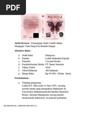 Di zaman yang digital ini kebiasaan membaca tetap saja menjadi sebuah tradisi yang . Contoh resensi buku novel fiksi & non fiksi lengkap, singkat. Resensi novel mariposa mochi's review rose amanda : Blurb novel mariposa karya luluk h. Laskar pelangi, dilan 1990, koala kumal, . Jawa barat tahun terbit : Resensi novel mariposa mochi's review rose amanda : Kumpulan contoh resensi novel fiksi terlengkap dan terbaru. Latihan resensi novel mariposa karya luluk h.f oleh tri widia identitas buku: Read sinopsis, blurb, dan resensi from the story materi kppw by kppw_club (komunitas penulis pembaca wattpad) with. Coconut book kota terbit : Resensi novel terbaru mariposa karya luluk hf resensi novel .